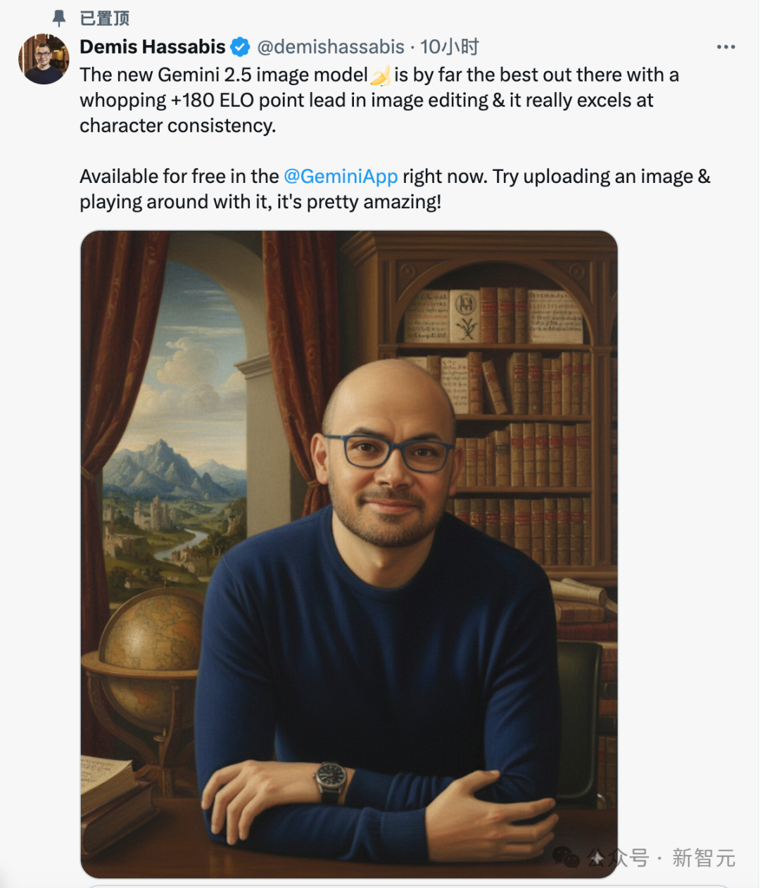 Demis还置顶了Nano banana为他创作的画像。