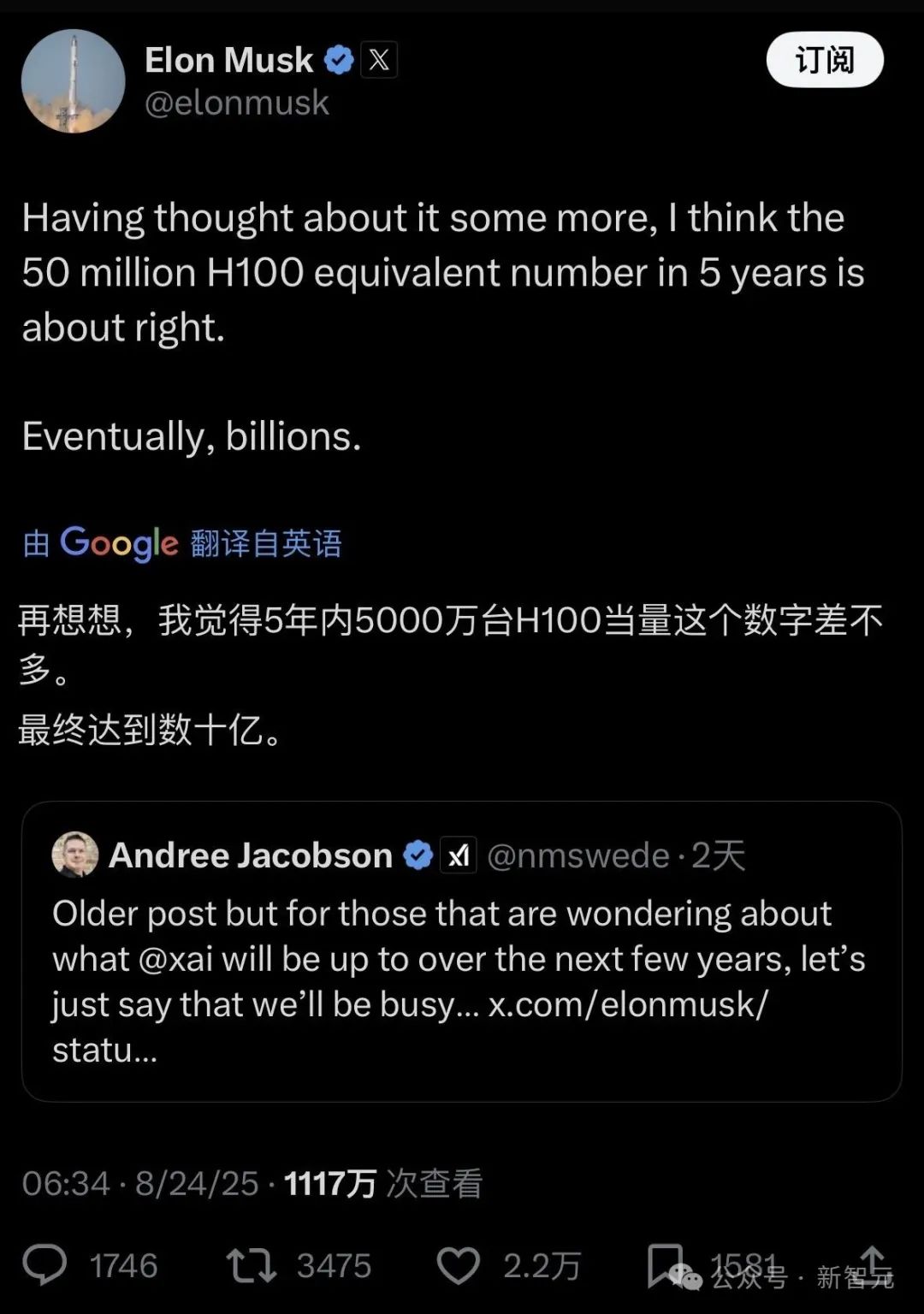 马斯克狂烧14万亿,5000万H100算力五年上线!终极爆冲数十亿