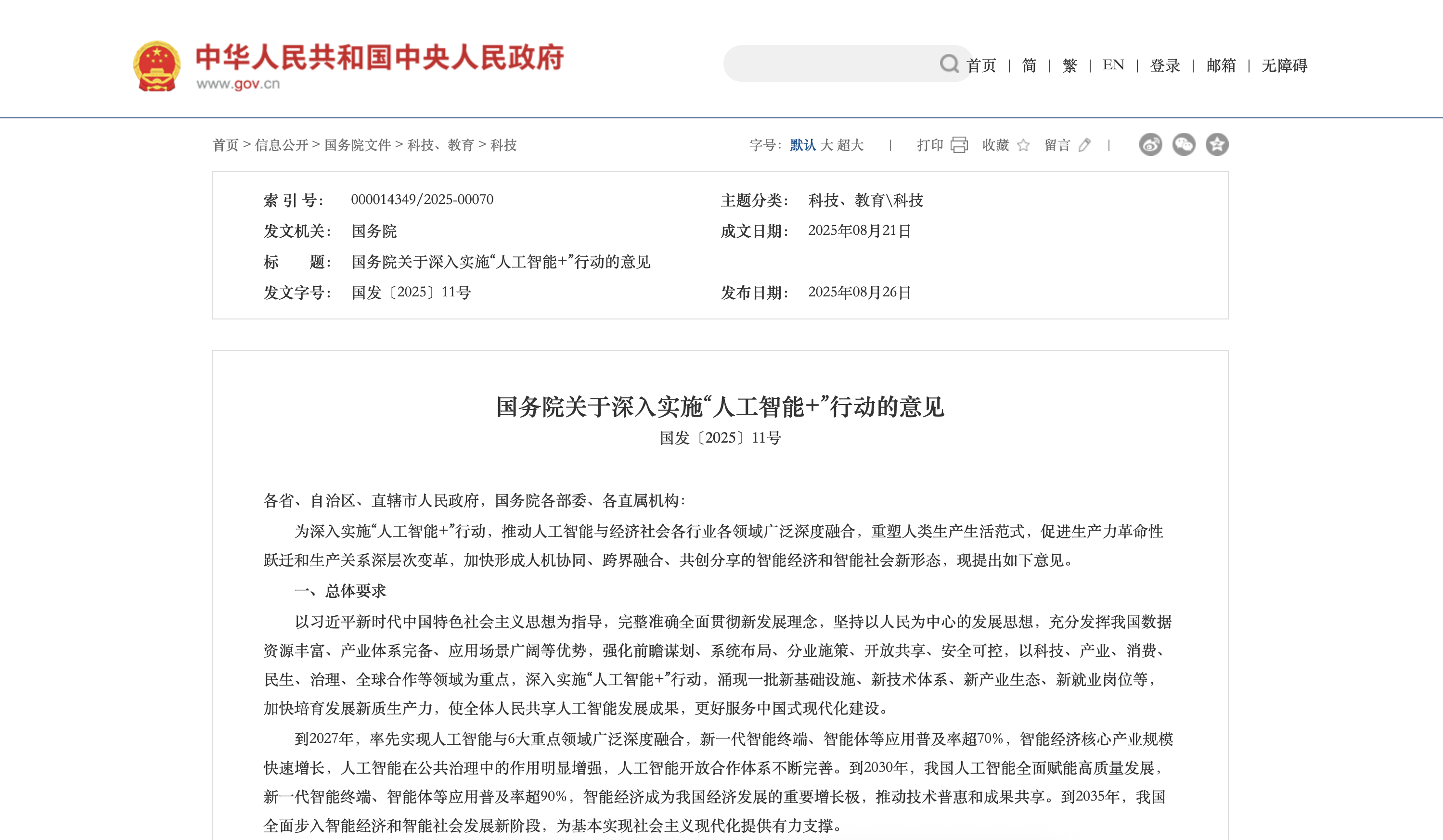 1、新政策发布:国务院发布《国务院关于深入实施“人工智能+”行动的意见》