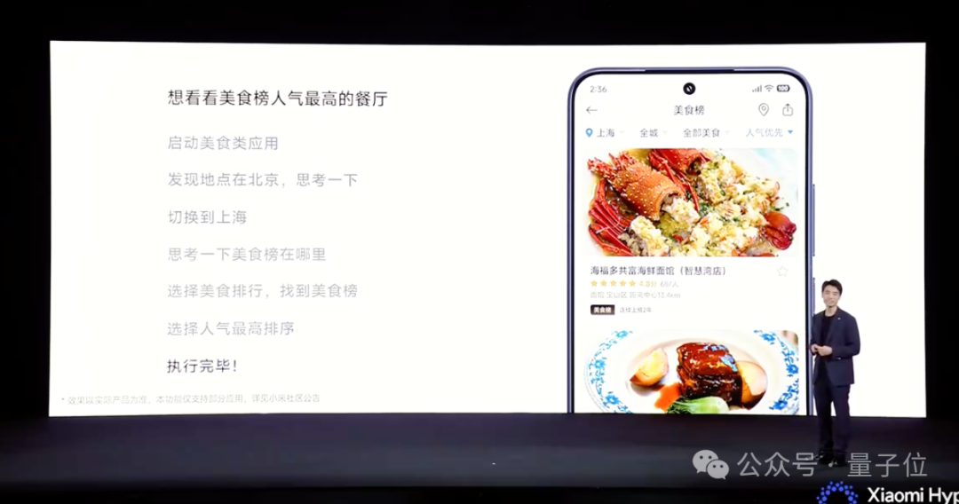 ,比如说你想要知道上海的美食榜人气榜首,超级小爱会启动相关应用,将地点自动切换到上海,然后选择美食榜,点击人气最高排序,得到结果。