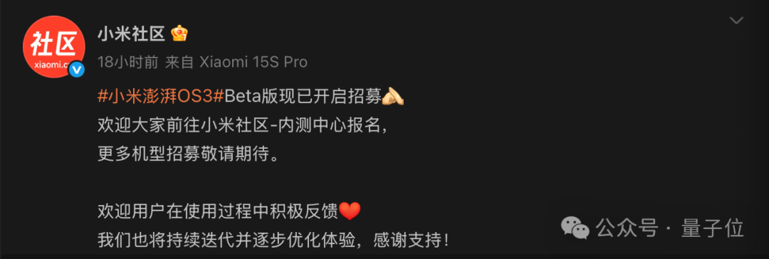 用户可直接前往小米社区APP,点击官方下的内测申请入口,即可看到OS3 Beta版测试。