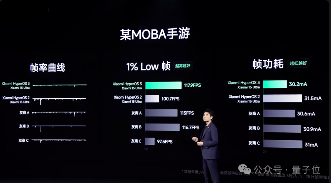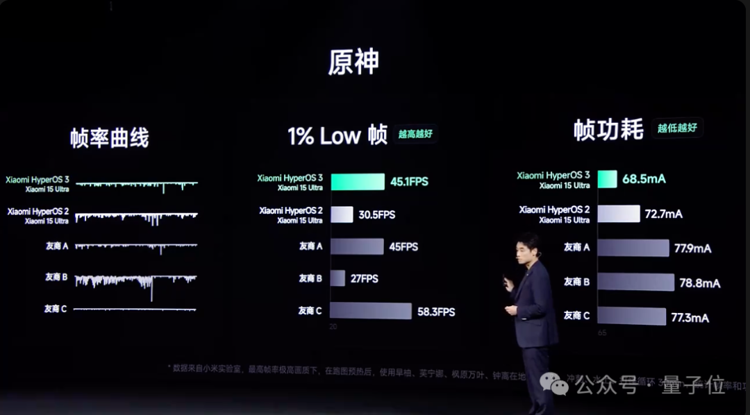 其次在游戏性能上,在《王者荣耀》和《原神》中,澎湃OS 3显著提升了1% low帧(最低平均帧率)并降低了帧功耗,展现了强劲的性能提升。