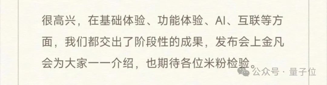 卢伟冰在给用户的公开信中表示,这次主要是在基础体验、功能体验、AI、互联等方面交出阶段性成果。