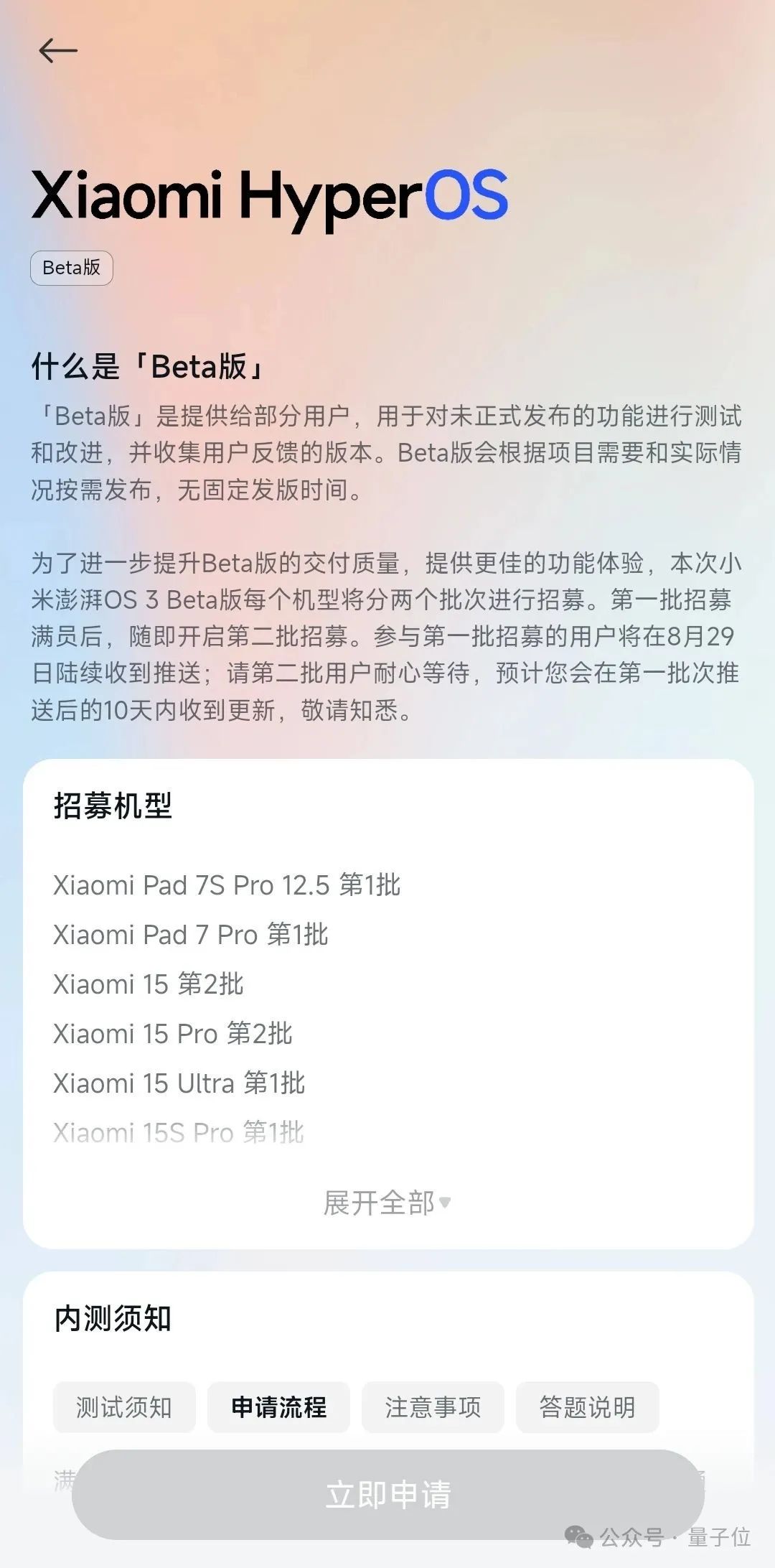 然后点击申请,即可进入报名页面,官方表示本次Beta版测试将分为以下几个批次进行招募,最早参与第一批招募的用户将在8月29日陆续收到更新推送。