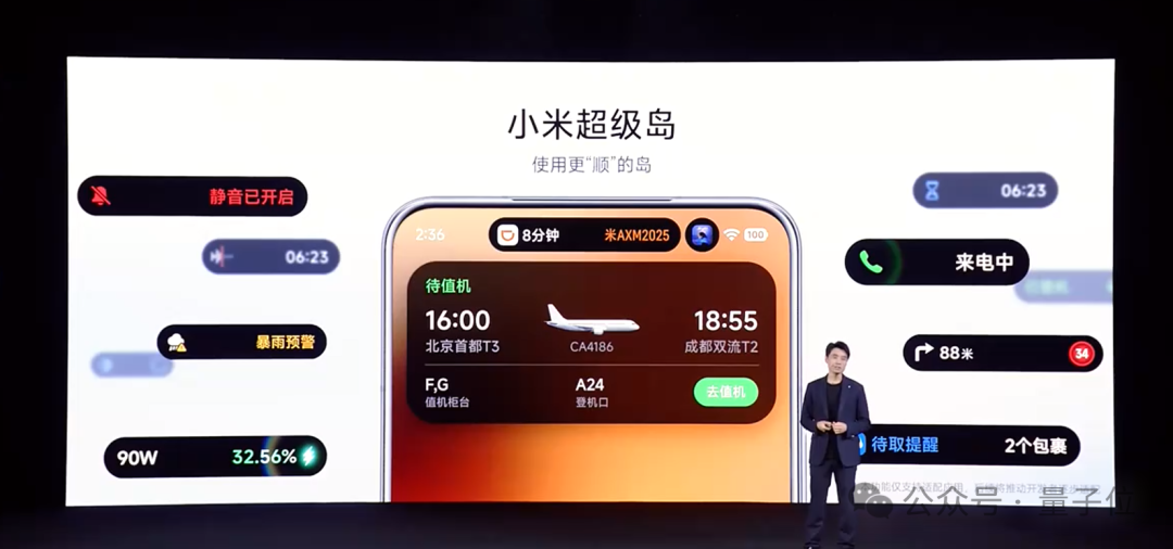 一方面定制了超载字体,在有限空间内完整展示多条信息(如打车信息、航班信息、电话等),并支持多任务流畅切换。