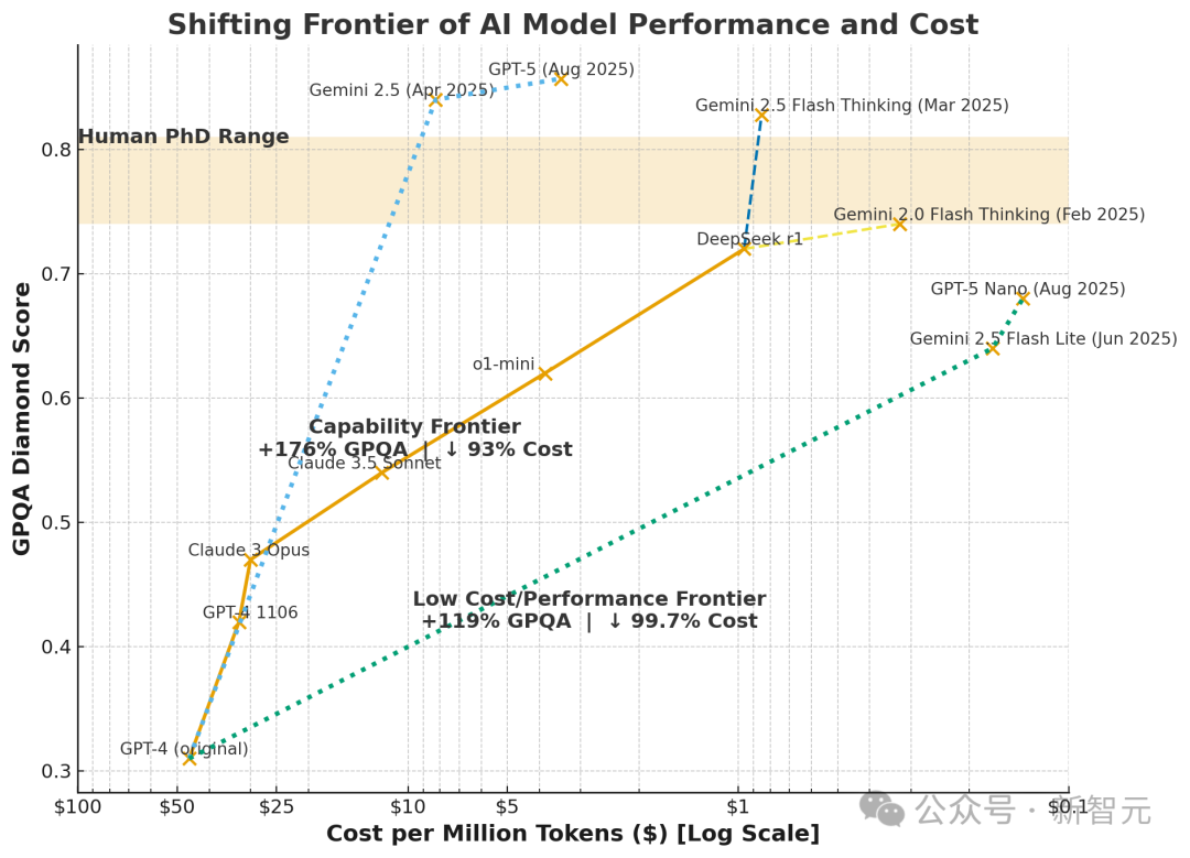 下图清晰地展示了这一趋势:y轴代表AI能力,x轴则表示呈对数级下降的成本。