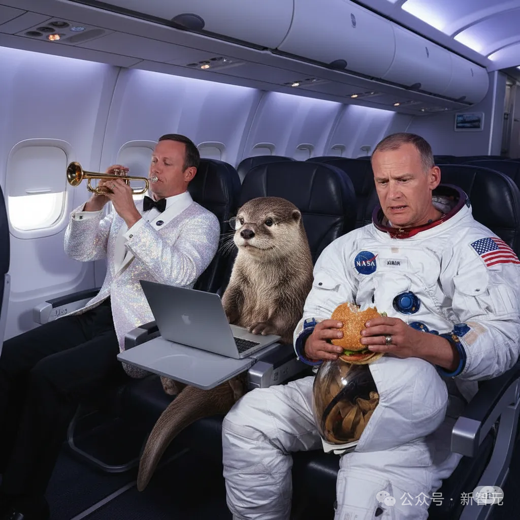 现在展示一张照片,尼尔·阿姆斯特朗和巴兹·奥尔德林穿着同样的衣服,坐在现代飞机的座位上。尼尔看起来很放松,身体后仰,正在吹小号;巴兹显得有些紧张,手里拿着一个汉堡。中间的座位上,坐着一只正在用笔记本电脑的逼真水獭。