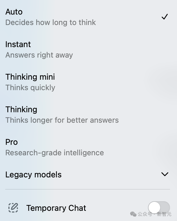 所以OpenAI在发布GPT-5后,淡化了模型的概念,淡化了思考和非思考的概念,而是变为自动、极速、短思考、认真思考和专业模式。