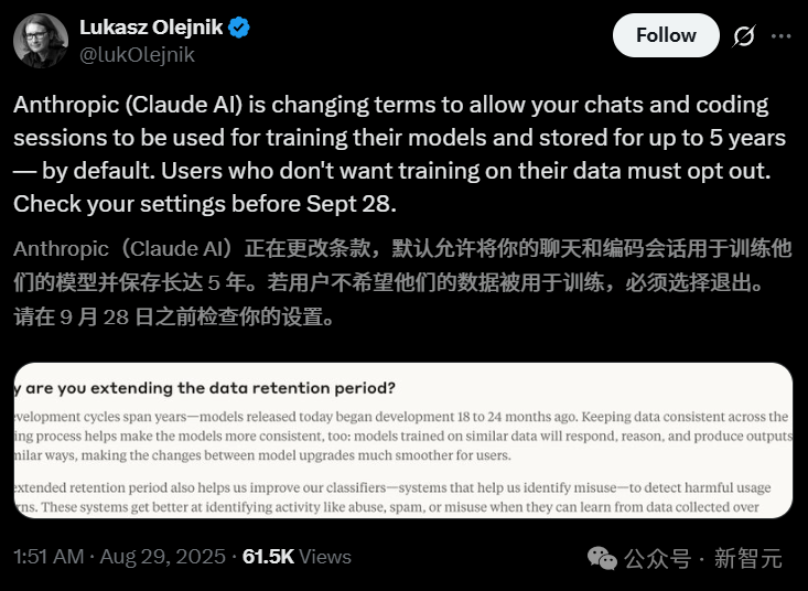 表面上,Anthropic是把「选择权」交给了用户,但只留了一个月的期限。