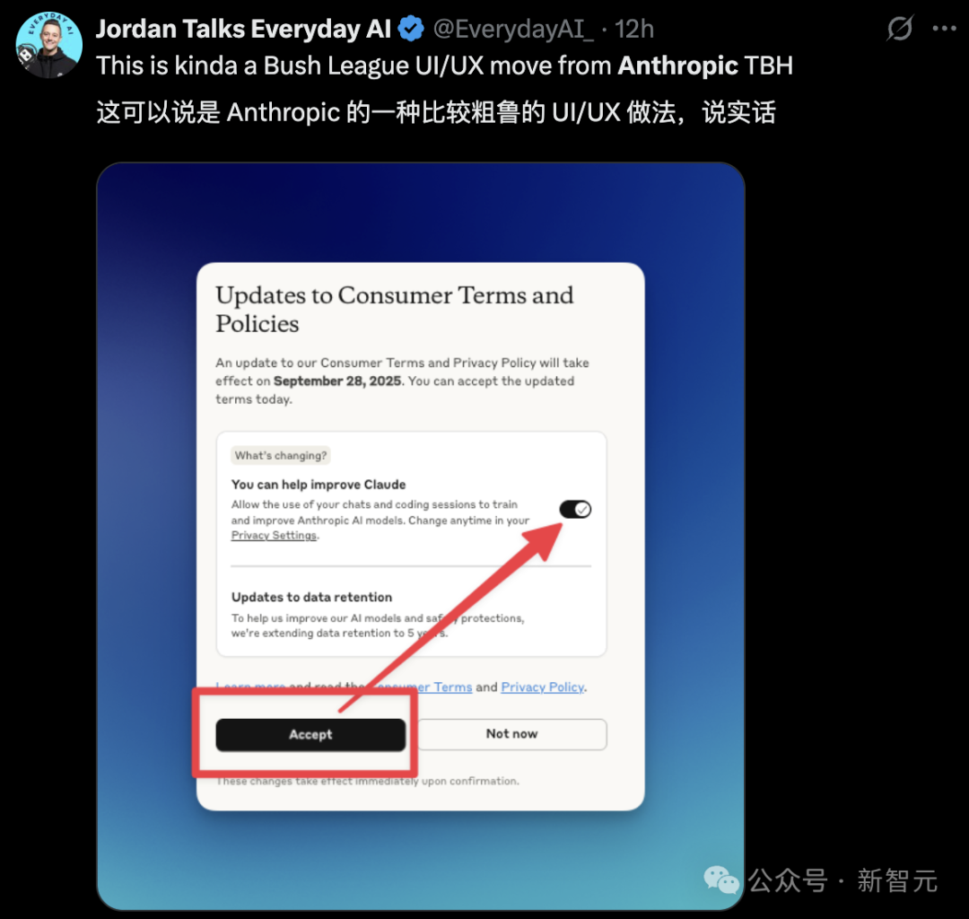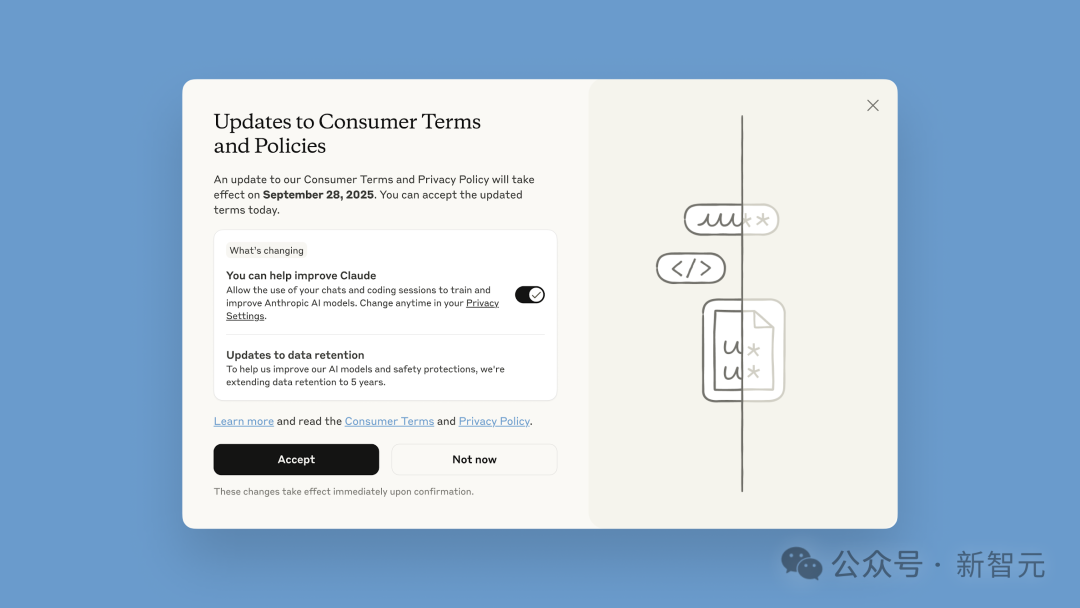 在Anthropic那篇关于此次政策更新的博客中, 它将变化包装成用户具有选择权的样子,声称: